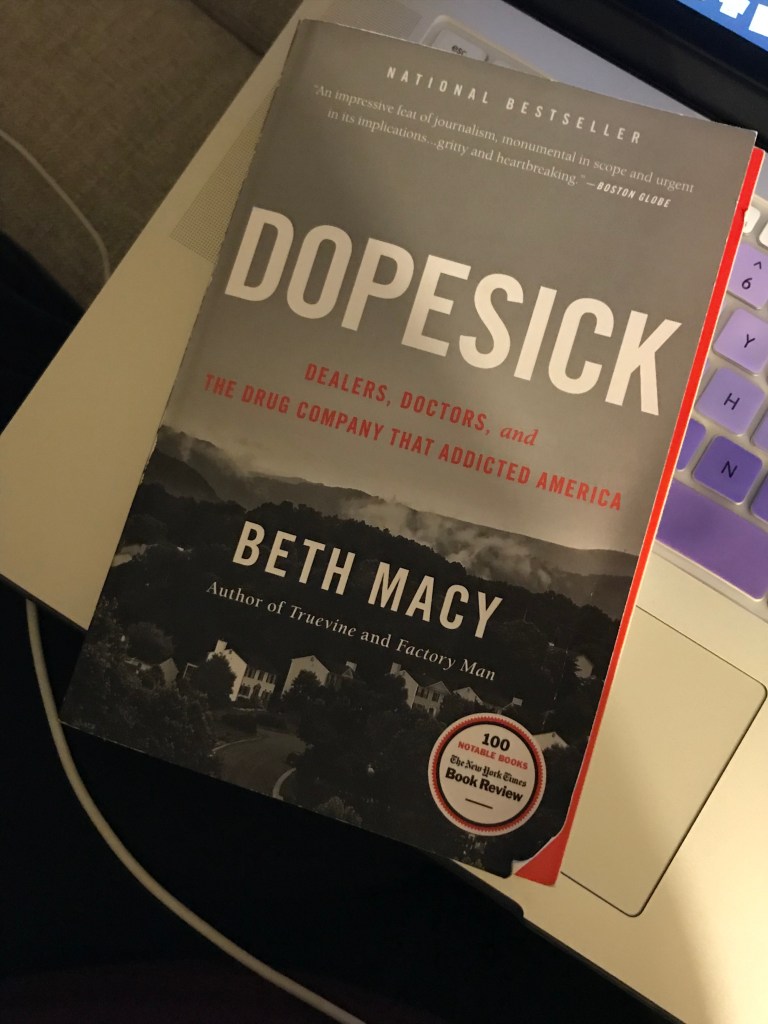 I’ve learned addiction becomes a family/community matter faster than other issues, because an addict doesn’t facilitate the addiction on their own. They rely on their friends, relatives, and other resources. And often abuse those relationships so they don’t become “dopesick”. According to this book, an addict doesn’t become an addict over-night, the problem began when drug companies sold a product no one expected to have the consequences that it did.
